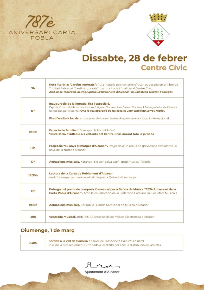 Amb l'objectiu de consolidar la jornada al llarg del temps, el pròxim dissabte, dia 28 de febrer, Alcanar celebrarà el 787è aniversari de la seua Carta Pobla amb un programa d'activitats molt ampli i per a tots els públics. El Centre Cívic, amb una fira d'entitats locals, serà l'epicentre d'una celebració que és fruit del treball conjunt de l'Ajuntament i el teixit associatiu del municipi.