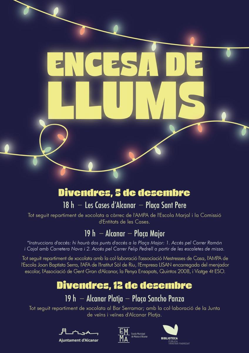 L'acte, organitzat per l'Ajuntament, no només comptarà amb l'encesa. La màgia de les llums anirà acompanyada del seu conte, de xocolata calenta i de moltes sorpreses. A Alcanar, es podrà accedir a la Plaça Major a través de dos punts, pel Carrer Ramón i Cajal amb Carretera Nova i pel Carrer Felip Pedrell a partir de les escaletes de missa.