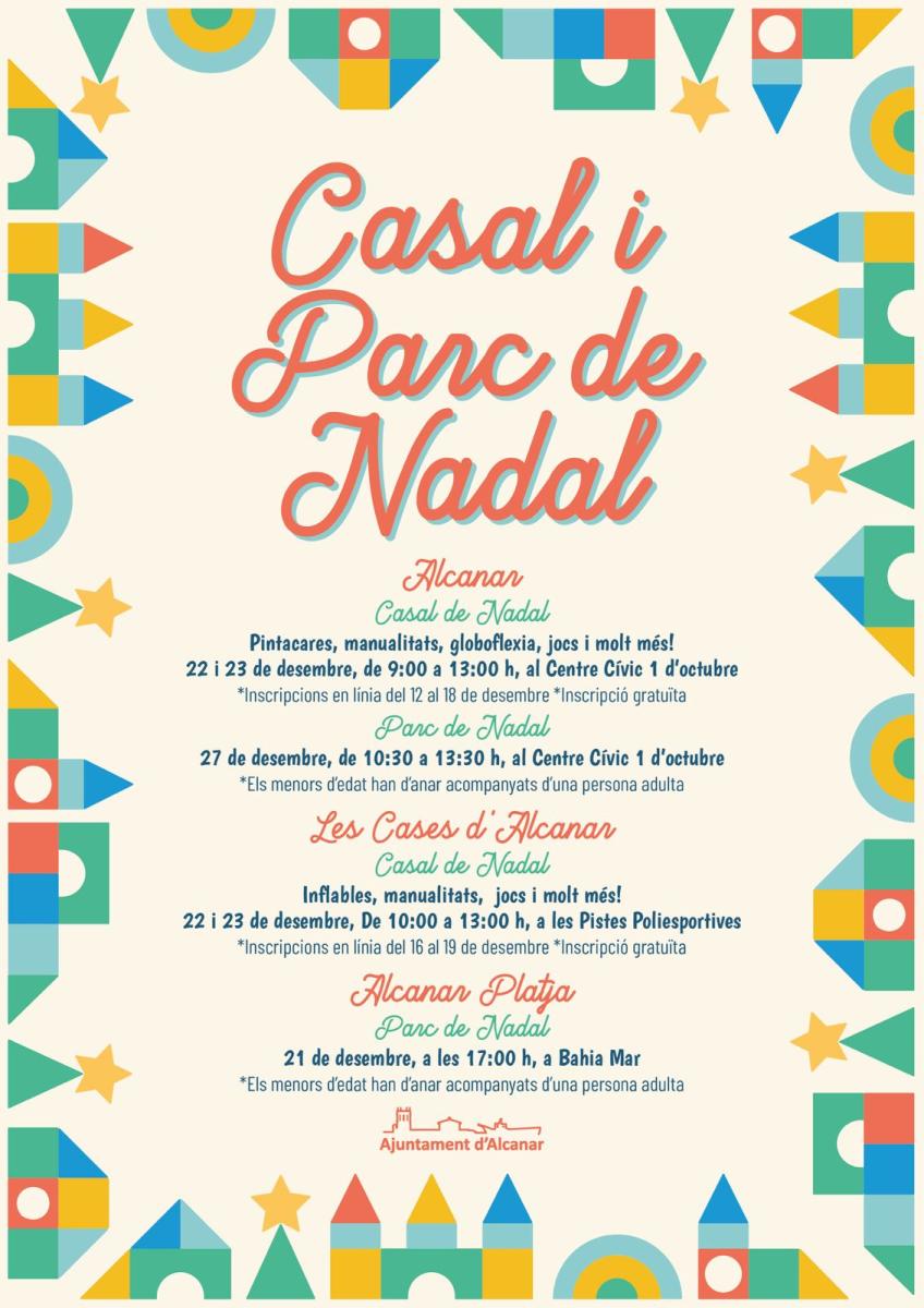 Dintre d'un programa de Nadal molt ampli i divers, que començarà aquest divendres, 5 de desembre, amb l'encesa de llums a les Cases d'Alcanar (18:00, Plaça de Sant Pere) i Alcanar (19:00, Plaça Major), el Casal de Nadal i el Parc de Nadal seran dues de les activitats troncals al municipi. Ambdós seran completament gratuïtes, emmarcades dintre del programa Temps x Cures, i oferiran un món de possibilitats als més menuts i menudes de casa.
