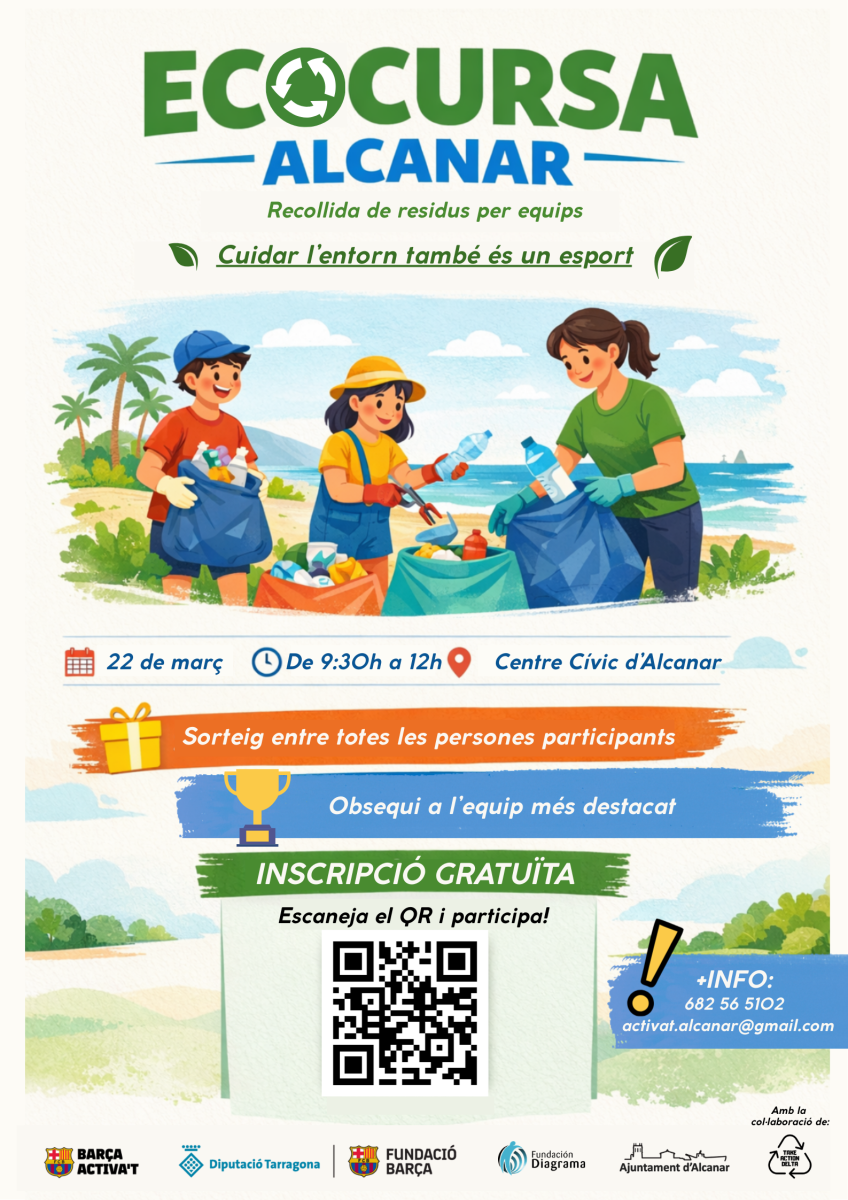 Amb el lema "cuidar l'entorn també és un esport", el diumenge 22 de març, Alcanar celebrarà una Ecocursa oberta a tota la ciutadania local i del territori. L'activitat, organitzada per Barça Activa't, la Fundació Barça, l'Ajuntament d'Alcanar, la Diputació de Tarragona, la Fundació Diagrama i amb la col·laboració de Take Action Delta, consistirà en una recollida de residus per equips amb obsequi per al grup més destacat i sortejos.