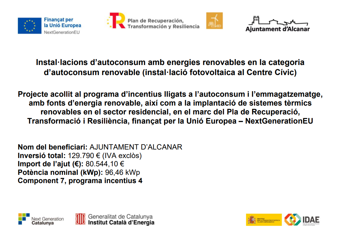 La instal·lació de les plaques és un projecte acollit al programa d'incentius lligats a l'autoconsum i l'emmagatzematge, amb fonts d'energia renovable, així com a la implantació de sistemes tèrmics renovables en el sector residencial, en el marc del Pla de Recuperació, Transformació i Resiliència, finançat per la Unió Europea – NextGenerationEU. Per aquest motiu, l'Ajuntament, que ha realitzat una inversió total de 129.790 € (IVA exclòs), ha rebut una subvenció de 80.544,10 €.