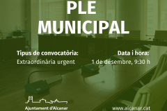 L’alcalde d’Alcanar, Joan Roig, ha convocat el Ple de la Corporació en sessió extraordinària urgent per al dilluns, 1 de desembre de 2025, a les 9:30 h, amb dos punts a l’ordre del dia.